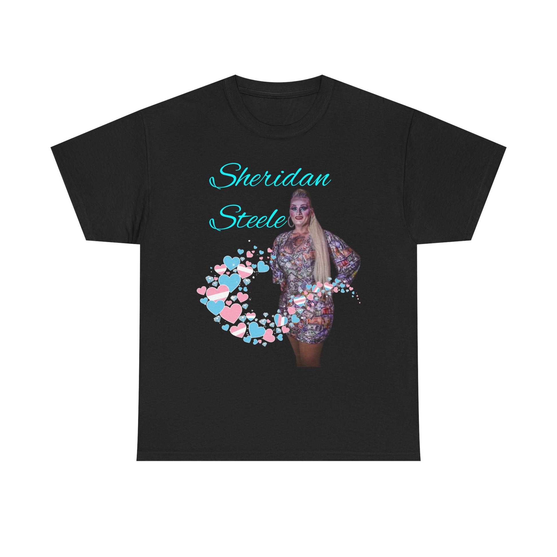 Wear your support with warmth and fierce tenderness. This portrait tee features a sparkling photo graphic of Sheridan Steele framed by glitter hearts — a quiet, proud shout of love for a drag artist and the trans community they represent. Soft, durable cotton sits close to the skin while the classic crew neck keeps the silhouette familiar and easy to layer. Picture it at a local show, folded into a care package for a friend coming out, or worn on a city walk where every passerby becomes a small witness to solidarity. The glitter details catch the light without shouting; the portrait keeps the person at the center. It’s more than merch — it’s personal affirmation you can wear.